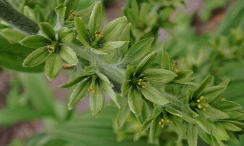 THE LEAVES: Large, broad, and oval. The veins are so prominent they create the “pleated” appearance. They are arranged spirally up the stem.