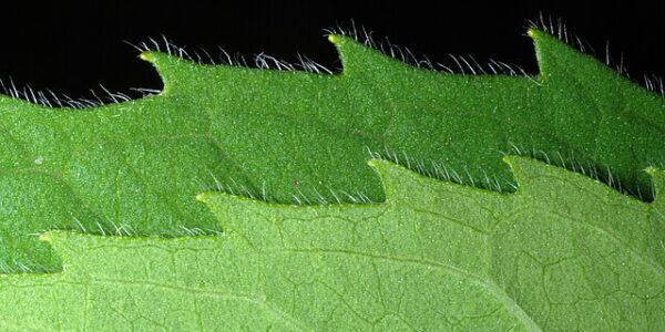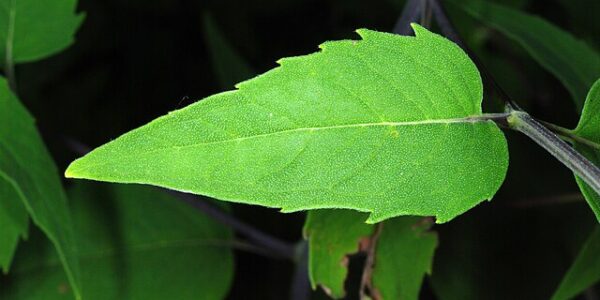 - Oval to heart-shaped leaves with serrated edges and prominent veining